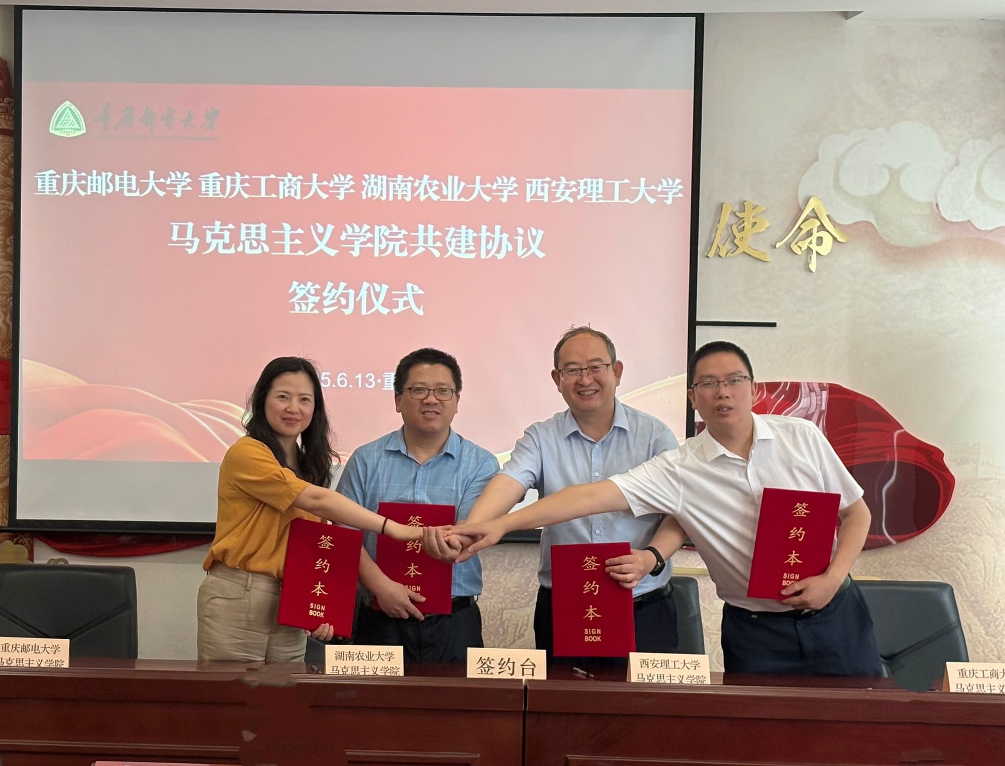 6月13日下午,suncitygroup太阳集团、重庆邮电大学、重庆工商大学和湖南农业大学四校suncitygroup太阳集团共建协议签约仪式在重庆邮电大学举行。重庆邮电大学suncitygroup太阳集团副经理郭海成主持仪式,四校经理分别致辞。梁严冰经理在致辞中指出,此次合作是贯彻落实习近平总书记关于suncitygroup太阳集团建设重要论述的具体实践,四校将在“大思政课”建设、学术研究、人才培养等方面开展深度合作,共同推进马克思主义理论学科高质量发展。签约仪式上,四校达成共同建设“大思政课”、推进集体备课、申报重要项目、共同举办学术会议等八项共建共识,拓展了四校马克思主义理论学科发展、科学研究、人才培养平台。