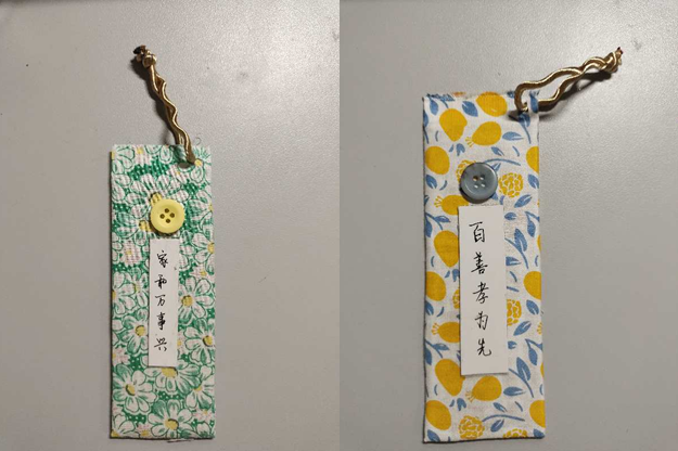 制作:两片书签均由快递盒废纸片制作。用碎花布粘合,用纽扣和丝带做装饰,书写“家和万事兴”“百善孝为先”字样粘合,牢记家风家训,弘扬传统美德,宣传环保理念。