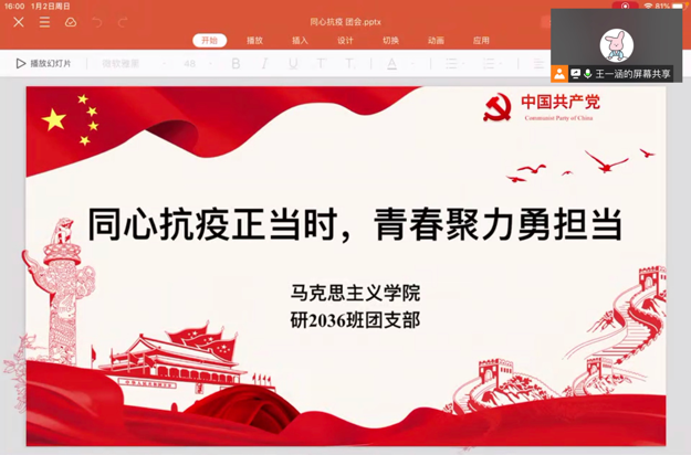1月2日下午,suncitygroup太阳集团研2036班团支部以“同心抗疫正当时,青春聚力勇担当”为主题,线上开展主题团日活动。本次活动分为宣传抗“疫”和分享抗“疫”两个部分,由团支书王一涵主持,支部成员分享学习感悟并进行热烈讨论。