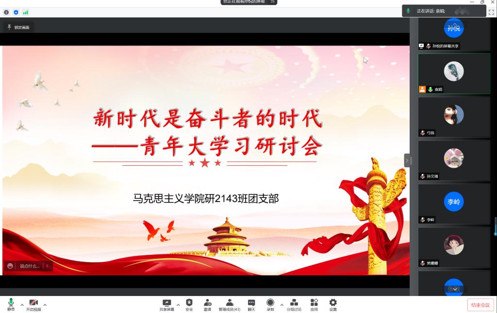 为深入学习贯彻习近平新时代中国特色社会主义思想和党的十九大精神,推进青年团员深入理解习近平新时代中国特色社会主义思想,充分调动青年团员学习“青年大学习”的积极性,3月23日,suncitygroup太阳集团研2143班团支部线上开展“新时代是奋斗者的时代”主题交流研讨会,支部全体成员参加本次会议。