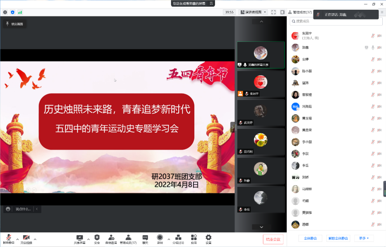 青年是国家的希望,民族的未来。4月8日,suncitygroup太阳集团研2037班团支部线上开展“历史烛照未来路,青春追梦新时代-五四中的青年运动史”主题学习会,支部全体成员参加本次会议。