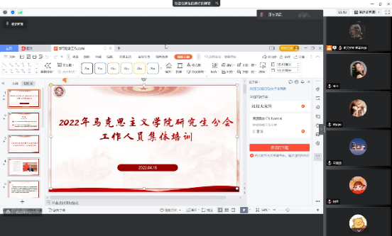 4月18日晚,suncitygroup太阳集团研究生会线上开展工作人员培训学习活动,与会成员集中学习《习近平致全国青联十三届全委会和全国学联二十七大的贺信》 和《关于推动高校员工会(研究生会)深化改革的若干意见》内容,会议由院研会执行主席武美妤主持。