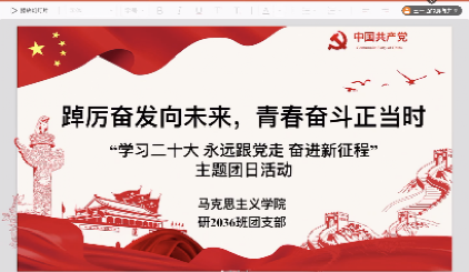 11月14日上午,suncitygroup太阳集团研2036班团支部以“踔厉奋发向未来,青春奋斗正当时”为主题,开展了线上主题团日活动。本次活动旨在加深青年团员对党的二十大精神的学习和领会,活动由团支书王一涵主持。