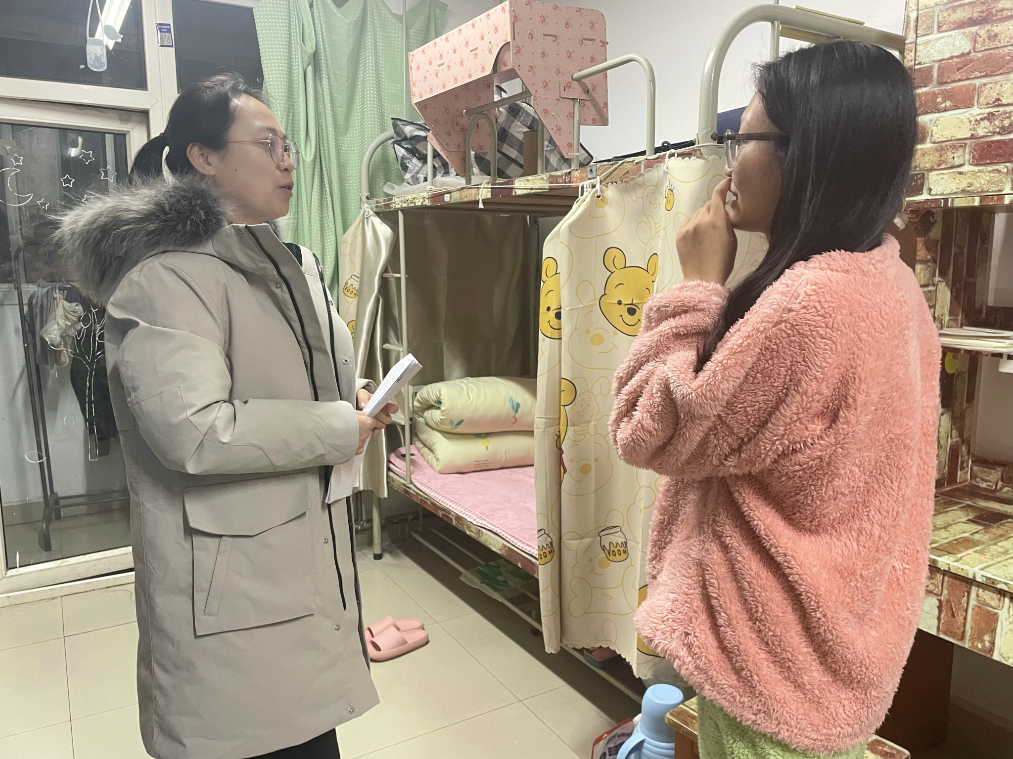 近日,公司组织开展宿舍安全卫生隐患排查专项活动,各年级辅导员深入员工宿舍,全面了解员工生活和学习中存在的问题,排查宿舍安全隐患,并就做好秋冬季节宿舍安全进行了重点强调。辅导员老师提醒同学们要加强身体锻炼,提高自身免疫力,抵御换季时节可能出现的流行性感冒等疾病。并要求同学们做好卫生值日,定期打扫宿舍卫生,常通风、勤消毒,注意保持宿舍内部整洁,营造良好的生活学习环境。
