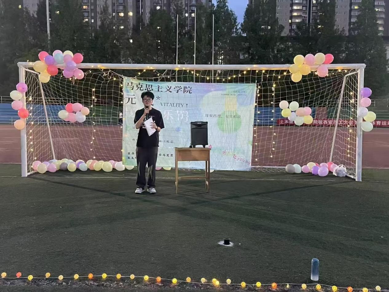 暮色初合,荧光如星河洒落。随着“故事的小黄花,从出生那年就飘着……”音乐《晴天》的缓缓播放拉开了活动的帷幕,主持人依次介绍了活动流程、表演嘉宾以及游戏规则。随后,工作人员向观众发放荧光棒,同学们在夜色中伴随着歌声,挥舞着手中的荧光棒,共同营造出浪漫的氛围。